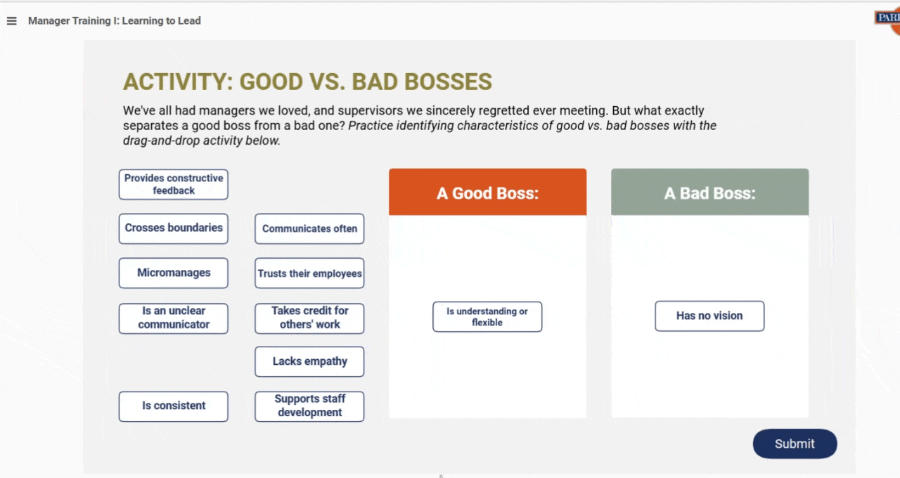 My client for this project, the Municipality of Park City, UT, wanted to develop a series of e-learning modules on best practices in leadership. These trainings are geared toward those in managerial positions in the City, of all levels of leadership experience, and deliver baseline knowledge and skills for supervisors as a prerequisite for in-person leadership development workshops.
